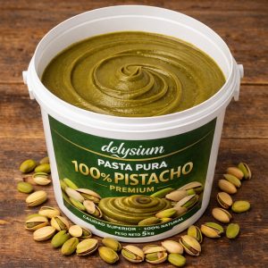 Pasta pura 100% pistacho Delysium en formato de 5 kg, elaborada sin aditivos ni azúcares añadidos. Destaca por su sabor intenso y textura cremosa, ideal para heladería, repostería y elaboraciones profesionales.